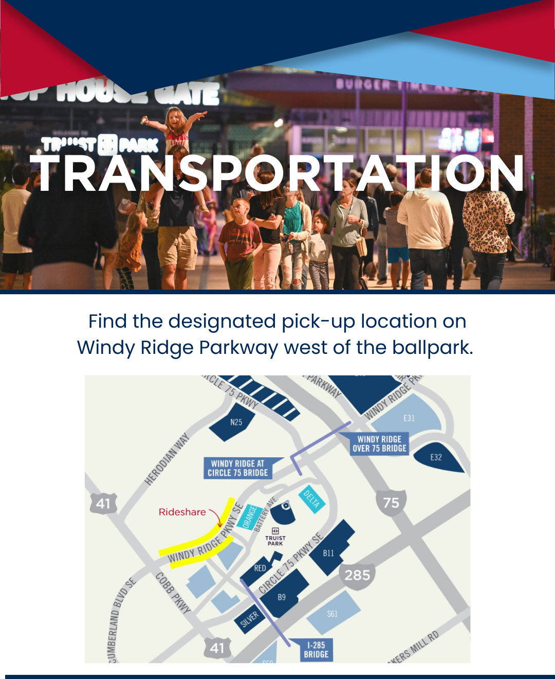 The Battery Atlanta and Truist Park are accessible via CobbLinc, MARTA, and the Cumberland Circulator.