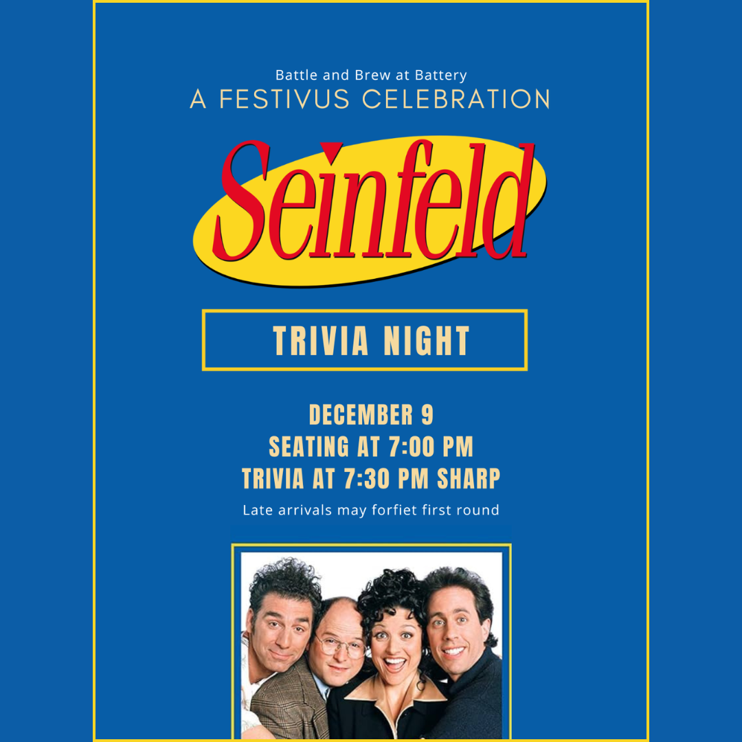 Battle & Brew 925 Battery Ave SE Suite 1125, Atlanta, GA, United States✨🥳 "It’s a Festivus for the rest of us!" 🎉 Join Battle & Brew on Tuesday, December 9th at 7:30 PM sharp for a Seinfeld-themed Trivia Night that’s all about […]