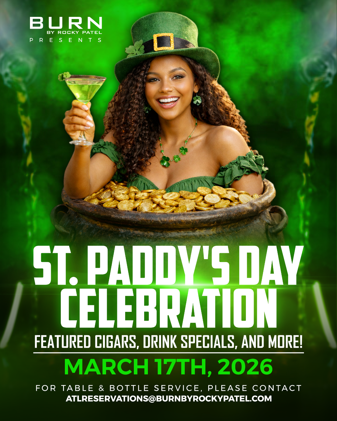 Join them for an elevated evening of premium cigars, signature cocktails, and high-energy atmosphere in the heart of ATL. Gather your friends, wear your best green, and experience St. Patrick’s day the BURN way!